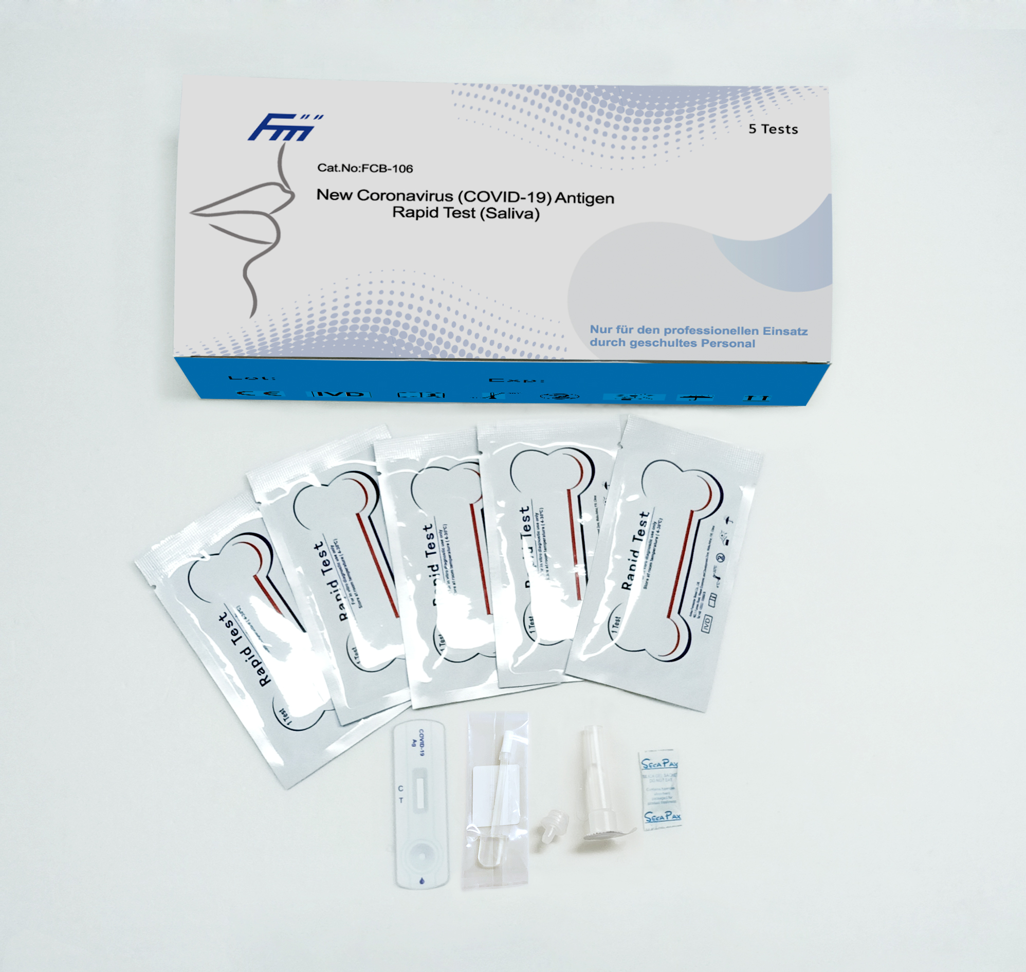 Dieser in-vitro-diagnostischer Schnelltest dient zum qualitativen Nachweis des Nukleoproteins des Coronavirus (COVID-19) im menschlichen Speichel. Mit dem Abstrichtupfer wird in der Mundhöhle, möglichst nahe des Rachens, eine Speichelprobe entnommen, die in das Extraktionsröhrchen gegeben wird. Die Flüssigkeit wird anschließend auf eine Testkasette gegeben.